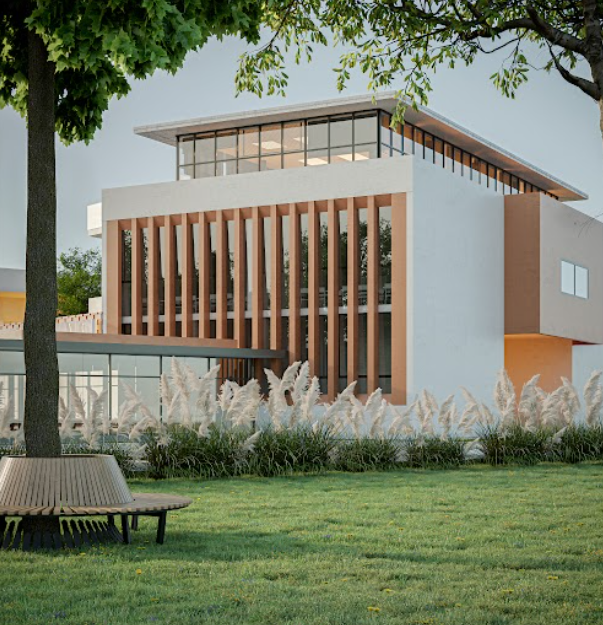 La façade rythmée par des brise-soleil verticaux assure une protection climatique optimale tout en apportant une signature architecturale élégante. Les espaces intérieurs sont pensés pour favoriser la concentration, la fluidité des circulations et la luminosité naturelle. L’entrée principale, largement vitrée, crée une transition ouverte et accueillante entre l’espace urbain et le cœur pédagogique du bâtiment.